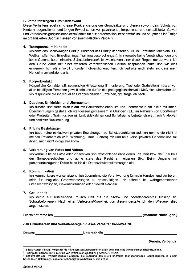 Der Verhaltenskodex und die Verhaltensregeln zum Kindeswohl (Anlage Ex. LSBH) wurden von allen in der Jugendarbeit tätigen Trainern und Betreuern unterschrieben.